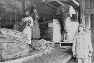 Ступив на берег и пройдя по сыпучему песку или по грязи, если прошел дождь, мы войдем в городские ворота. Эти два высоких белых обелиска, украшенных золочеными двуглавыми орлами, — главная городская застава. Запинаясь за выбитые камни потрепанной булыжной мостовой, подымаемся по Молочной горе. Налево от нас — каменное здание пекарни Кореновкиной и казенная винная лавка, около которой всегда толпа постоянных посетителей — «золоторотцев», или «зимогоров», как в Костроме называли босяков, грузчиков, плотогонов и прочих любителей продукции этой лавочки. Направо — такой же курень (пекарня) Таганцева, а выше по обеим сторонам — лавчонки, торгующие различной неприхотливой снедью (часто и недоброкачественной), пивные, чайные, с продажей крепких напитков.