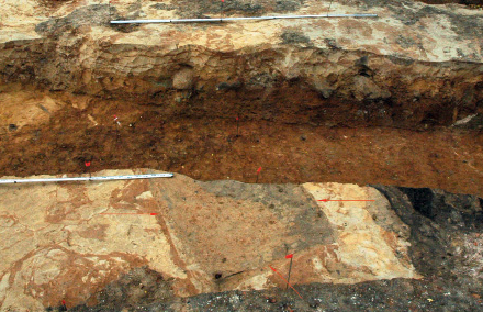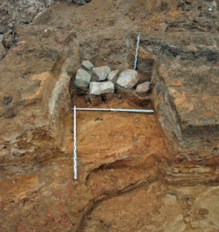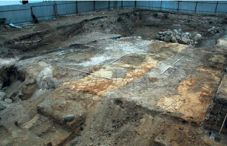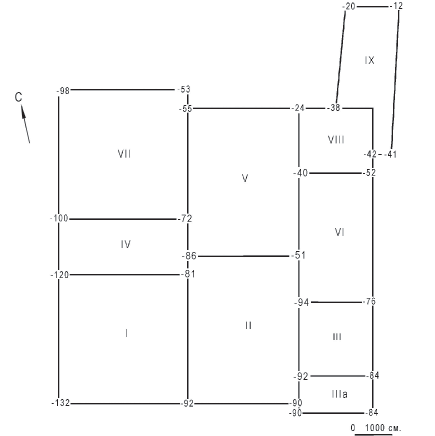 Исследования в рамках северной и центральной частей участка II (рис. 1–2) установили факт наличия не особо большой мощности слоя балласта1 (рис. 3) по сравнению с участком I. Причина объяснялась нами в предыдущих статьях [Кабатов, Кабатова 2021: 22; 2025]. Нивелировка уровня дневной поверхности выявила понижение уровня дневной поверхности относительно СВ угла участка – в южном, ЮЗ и западном направлениях на 39, 41 и 51 см соответственно. После снятия балласта (рис. 4–5) на уровне «пола» 4-го горизонтального пласта была убрана рыхлая земля и выведен единый горизонтальный уровень (рис. 6).