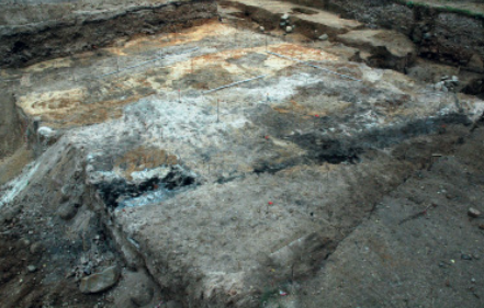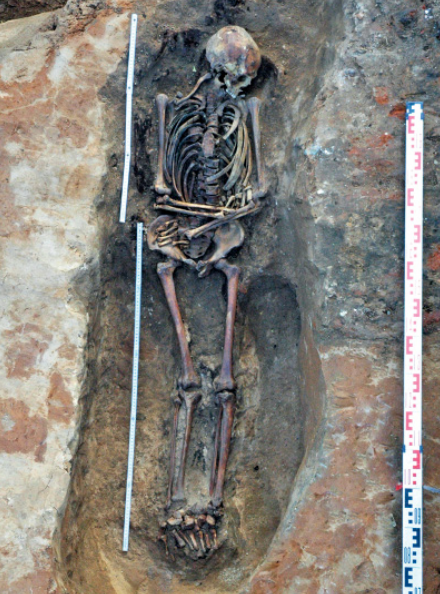 И последнее, выявленное погребение (объект № 10) меридиональной ориентации, во-первых, по- зволяет говорить о том, что строящийся Успенский собор частично (как минимум в рамках участка II) ставится на городской некрополь, существовавший здесь до этого. Это предполагает иную планиров- ку городской территории до начала строительства и наличие где-то поблизости церкви, которой и при- надлежал данный погост. А во-вторых, меридио- нальная ориентация погребенного с классическим христианским положением тела, рук и ног костя- ка позволяет нам ставить вопрос о наличии в среде городского населения Костромы до середины XV в. элементов похоронной обрядности дохристианско- го времени.