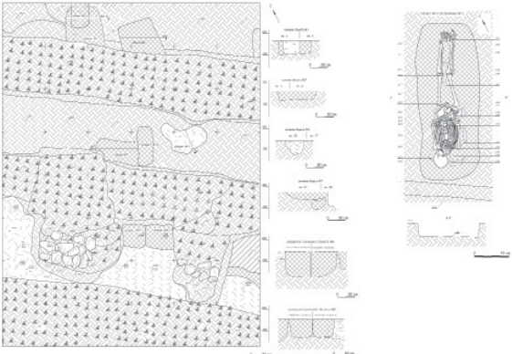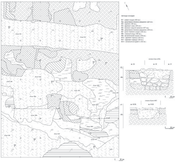В процессе разбора культурного слоя в рамках участка II зафиксировано 11 объектов (№ 1–1а, 2–5, 5а, 5б, 6–10).