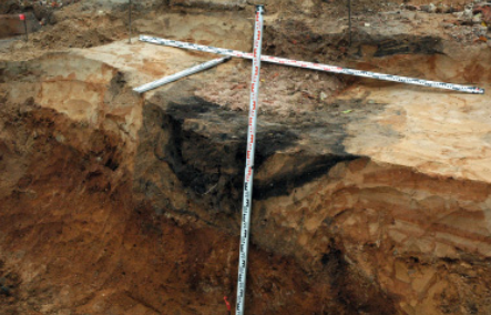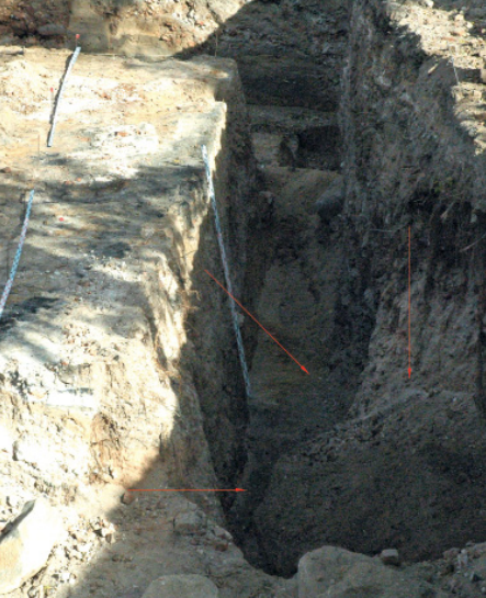Объект № 3 (7) (рис. 6, 12 13) – ров основания южной стенки основного ядра собора (первый строительный период) фиксируется во 2-й и 3-й линиях квадратов (кв. 7–18), а также в западной части кв. 1 и ЮВ части кв. 6. Азимут центральной оси рва порядка 127°, ориентация – ВЮВ-ЗСЗ, ширина порядка 254 см. Дно рва южной стенки основного ядра собора имеет постоянное понижение в западном направлении с –283 см8 до –358 см9, то есть в рамках участка II на протяжении 12 м перепад высот уровня дна рва составляет 75 см. На уровне фиксации материка в фиксирующихся границах объекта № 3 прослежены следы стоящих здесь ранее вертикальных столбов диаметром не более 10 см (рис. 7), стесанных в нижней части на три грани, которая забивалась в грунт. Столбы были вытащены из земли во время разбора валунного основания стен; в оставшихся ямках балласт, как и в самом рву. Всего в объекте № 310 фиксируется шесть параллельных рядов, расстояние между которыми 45–55, иногда до 60 см. Расстояние между ямками от столбов в ряду в среднем 45–60 см. Ряды ориентированы параллельно центральной оси рва фундамента южной стенки основного ядра собора первого строительного периода.