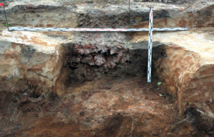 Объект № 5б (рис. 6, 14–15, 18) фиксируется в кв. 29–30, 35–36, 41–42 и имеет почти подпрямоугольный в плане контур. Сечение, выполненное на стыке линий квадратов 42/36 – 41/35, выявило следующее. Вся северная и центральная части объекта выбраны вместе с валунами в период взрывных работ и разбора кирпичной кладки Успенского собора. Лишь разбор оставшейся южной части рва контрфорса выявил несколько валунов нижнего придонно- го яруса, покоящихся, как и в предыдущем случае, на серии вертикальных столбиков. Это контрфорс, поставленный снаружи храма на земле для большей устойчивости южной стенки собора (объект № 5).