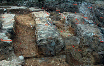 Объект № 5а (рис. 6, 14–16) фиксируется в кв. 19– 21, 25–27, 37–39 и имеет подпрямоугольный в плане контур. Зафиксировав факт его существования при разборе объекта 5, было сделано сечение в линии квадратов 31–3315. Сечение выявило следующее. Сначала продольный ров под контрфорс был выкопан шириной 422 см16 и 178 см глубиной. Затем по западной части рва на вертикальные столбики17 (рис. 7) уложили валунную кладку в 4 яруса. Интересный Рис. 13. Фото участка II после снятия балласта и зачистки на уровне 4-го горизонтального пласта: объекты № 3 и 5 после выборки заполнения (указаны стрелками). Общий вид с СВ факт – между ярусами не фиксируется известковый раствор, цементирующий валуны; вместо него между валунами везде – подсыпка из строительного мусора с мелкими фрагментами кирпича. Ширина валунной кладки не превышает 314 см, оставшуюся восточную часть рва залили на половину высоты валунной кладки красно-коричневым суглинком18, а сверху перекрыли простой подсыпкой (пестроцвет). Функциональное назначение – контрфорс южной стенки второго строительного периода Успенского собора.