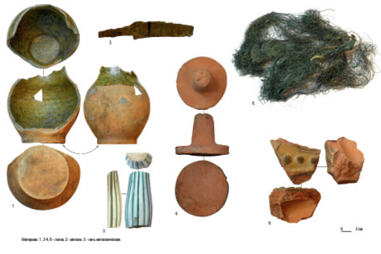 Весь керамический комплекс представлен се- ро-глиняной (V, VI, VIII, IX, X, X', X'', XI, XI' типы костромской гончарной керамики, оформ- ление – волна, горизонтальные линии, насечка), красно-глиняной (VIII, X', X'', XI типы, оформле- ние – горизонтальные линии, волна, насечка), чер- но-лощеной (IX тип) и бело-глиняной посудой. Подобная керамика укладывается в рабочую клас- сификацию костромской гончарной керамики: IV и V типы имеют хронологические рамки бытова- ния XIII–XIV вв., VI тип – 2-я половина ХIII–ХV вв., VIII тип – XIV–XV вв., IX тип – 2-я половина ХV в. – ХVI в., X тип – 2-я половина ХV в. – ХVII в., XI тип – 2-я половина ХVII в. – ХIХ вв.