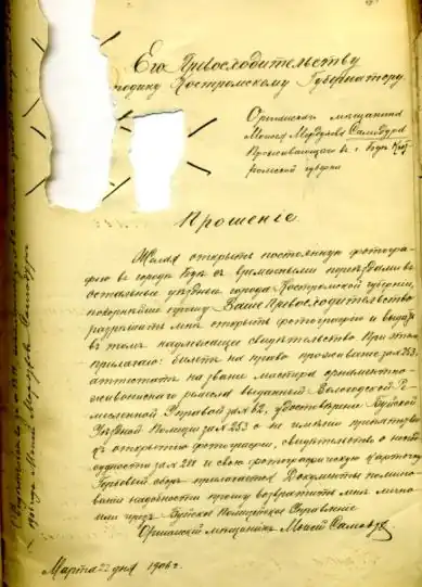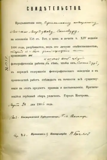 Здесь он подаёт Прошение на имя Костромского губернатора с просьбой открыть в Буе фотографию. Прошение датировано 22 марта 1906 г. К Прошению прилагались с рядом других справок и Диплом мастера орнаментно-живописного ремесла, выданный Вологодской Ремесленной Управой за № 62. Одновременно он подаёт Прошение и на открытие фотографии в Галиче. 24 марта 1906 года Самодур-Смодер получает Свидетельство № 1351 о разрешении открыть фотографию в Буе. Свидетельство было подписано губернатором Костромской губ. 24 марта 1906 г. (фото 2).