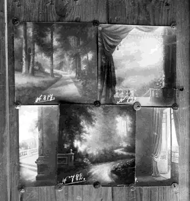 Большое внимание М.М. Смодор уделял оформлению своей фотографии. Он и сам был мастером орнаментно-живописного ремесла. Это звание ему присвоила Вологодская Ремесленная управа, выдав удостоверение за № 62. И, конечно, привлекал к оформлению фотографии своего друга, галичского художника Ивана Ивановича Каликина. На фото 9 показаны эскизы живописных «задников» в фотографии. Фотография выполнена М. Смодором.