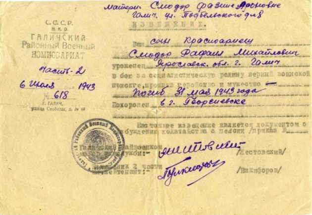 Михаил Маркович умер суровой снежной зимой 4 января 1944 года, о чём была сделана запись в книге регистрации Галичского ЗАГСа.
