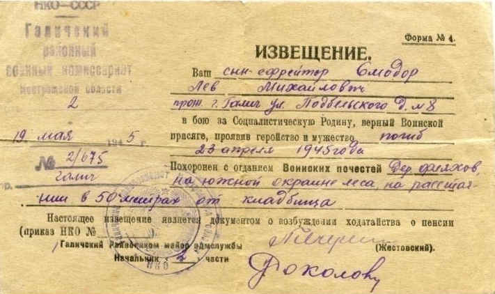 Лев погиб 23 апреля 1945 года от пули польского снайпера, чуть-чуть не дожив до победы, в бою за деревню Линум. Похоронили его с воинскими почестями у деревни Фляхов на Польской земле. Похоронки на детей представлены на фото 25.